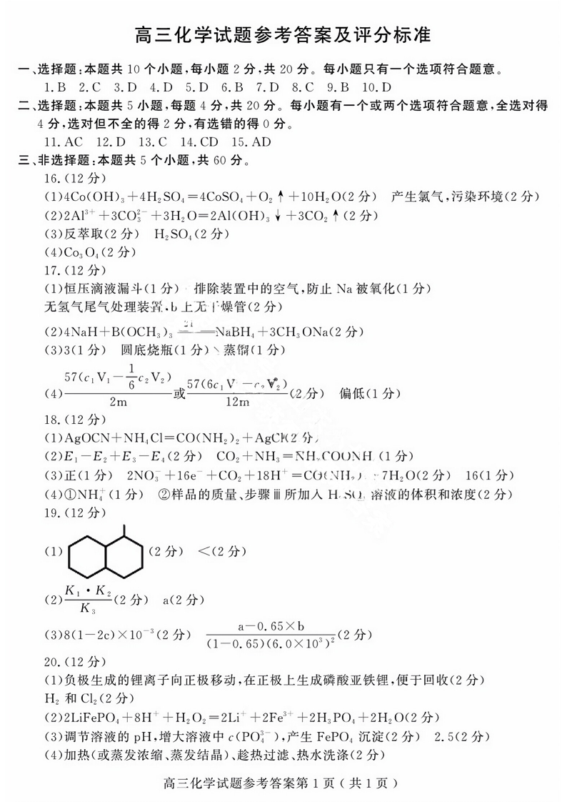 山东省潍坊市2024届高三上学期10月过程性检测化学答案