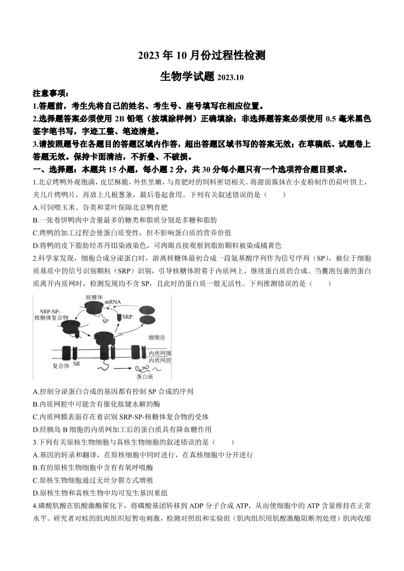 山东省潍坊市2024届高三上学期10月过程性检测生物