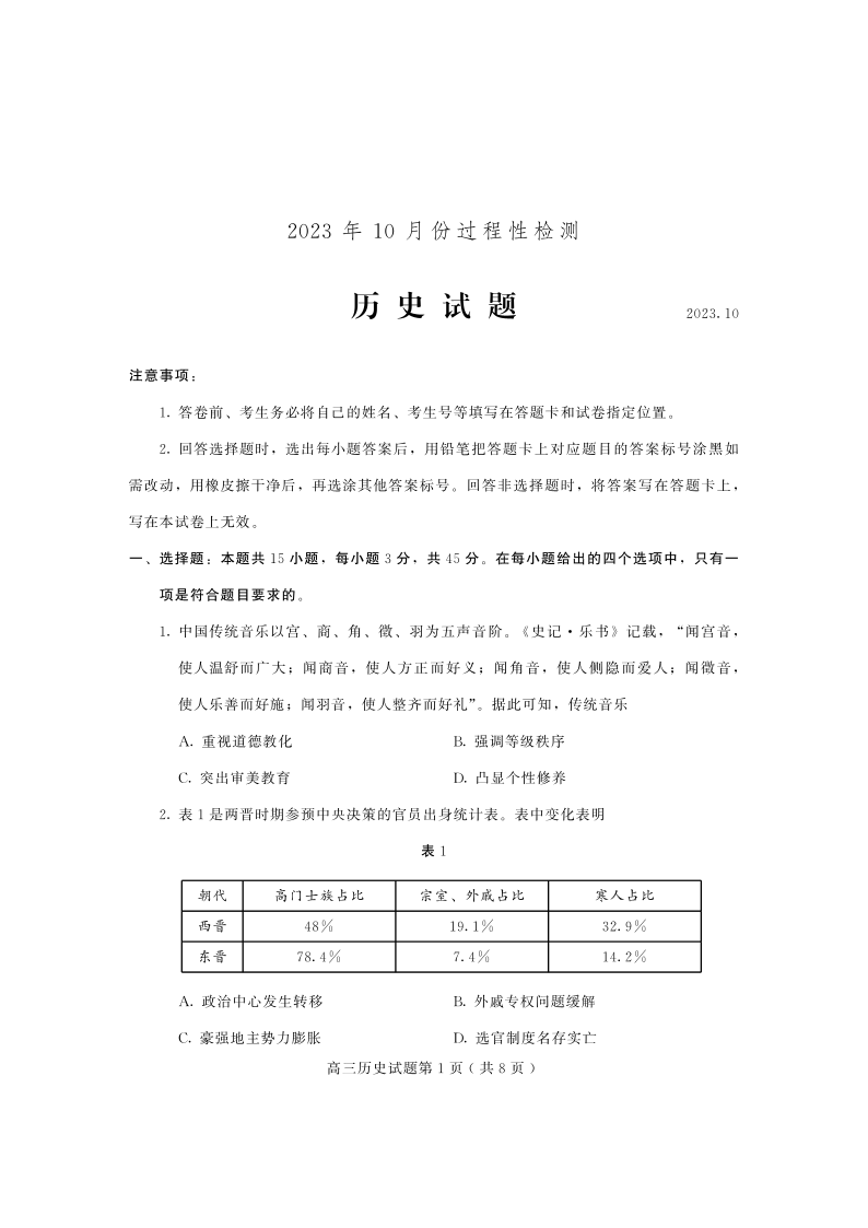 山东省潍坊市2024届高三上学期10月过程性检测历史