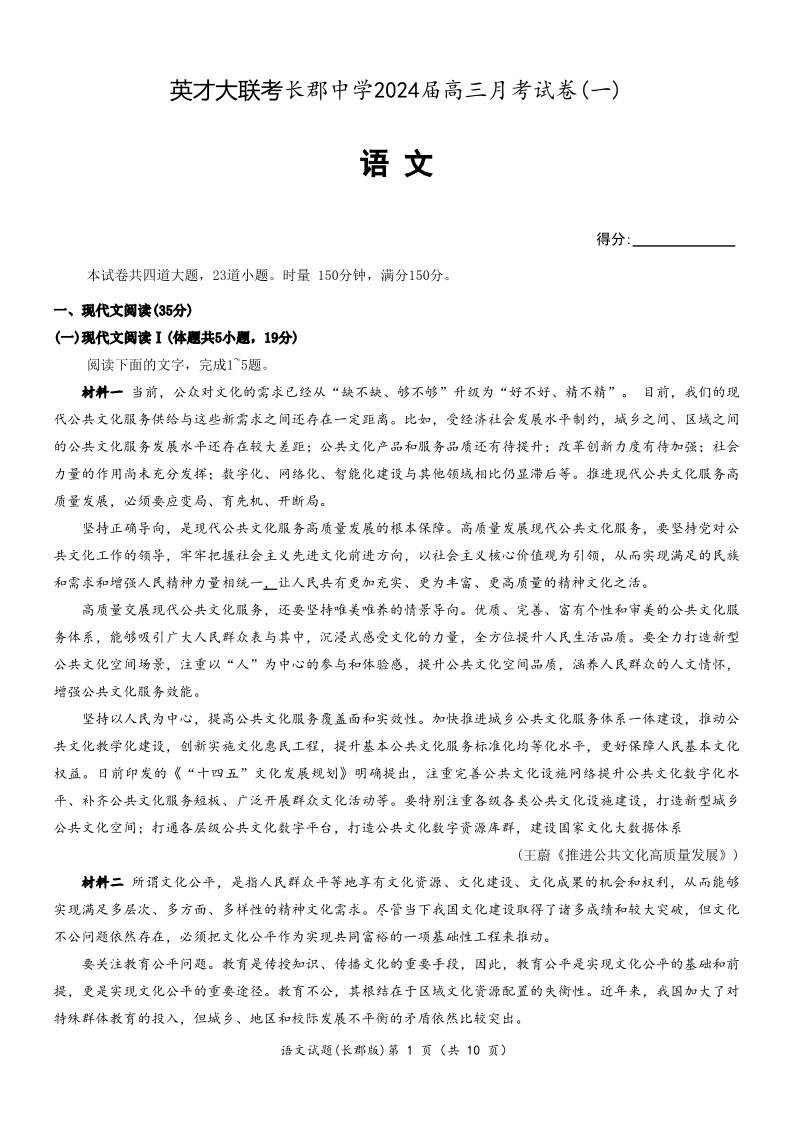 湖南省长沙市长郡中学2024届高三月考(一)语文