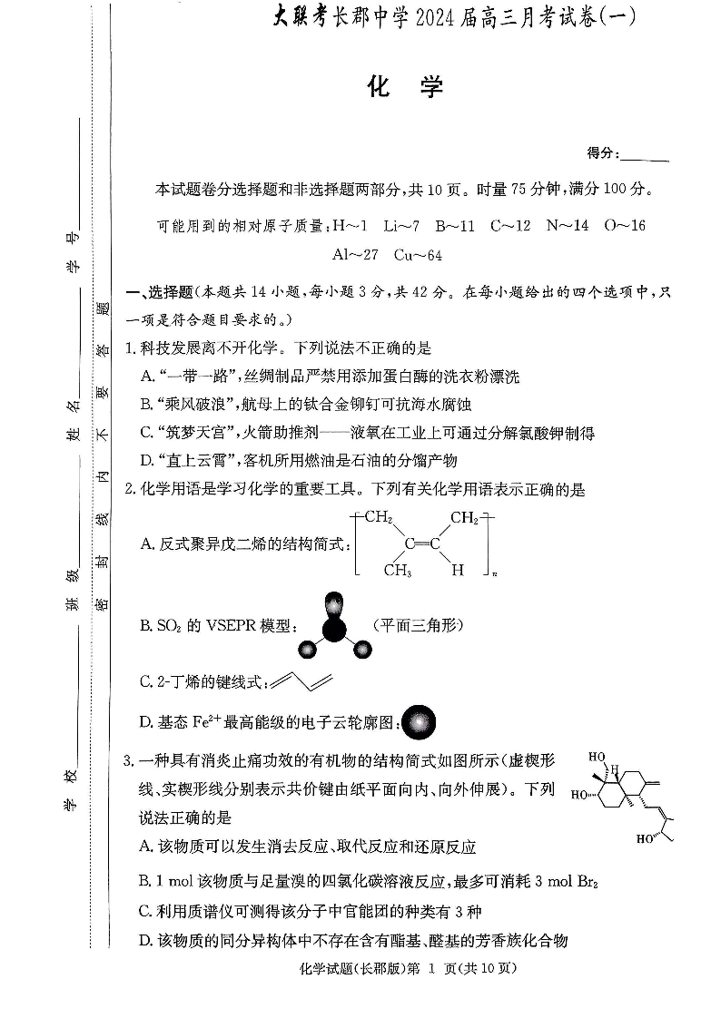 湖南省长沙市长郡中学2024届高三月考(一)化学