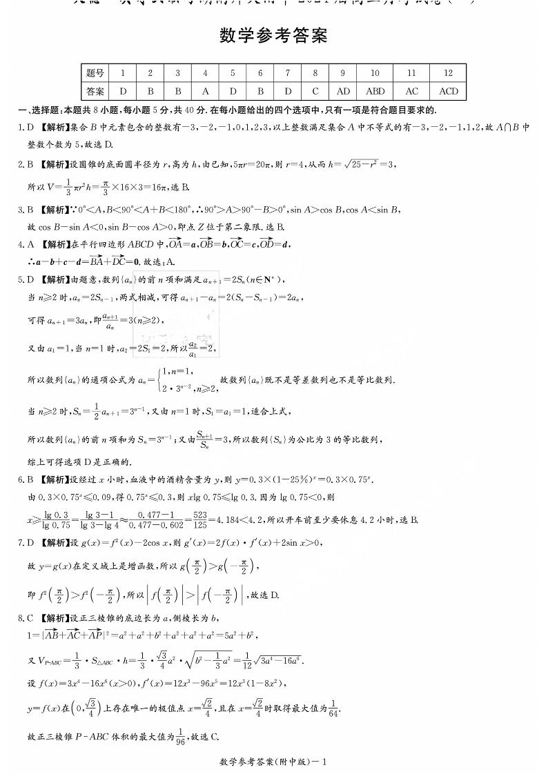 湖南师范大学附属中学2024届高三上学期月考(一)数学答案