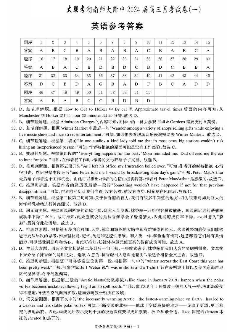 湖南师范大学附属中学2024届高三上学期月考(一)英语答案