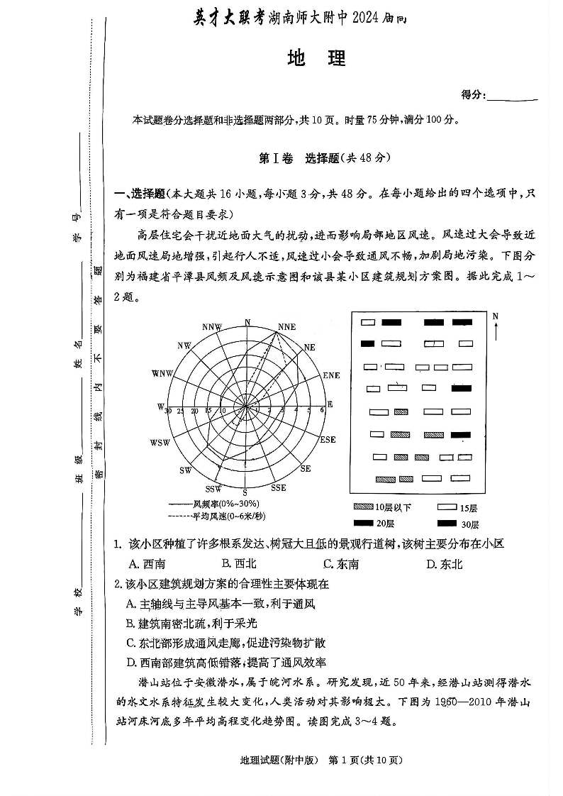 湖南师范大学附属中学2024届高三上学期月考(一)地理