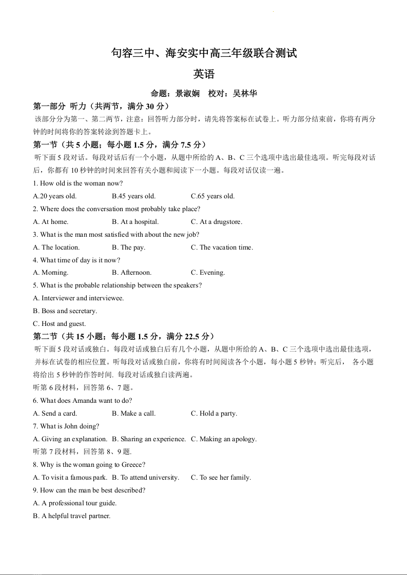 江苏省句容三中、海安实验中学联考2023-2024学年高三上学期10月月考试题英语