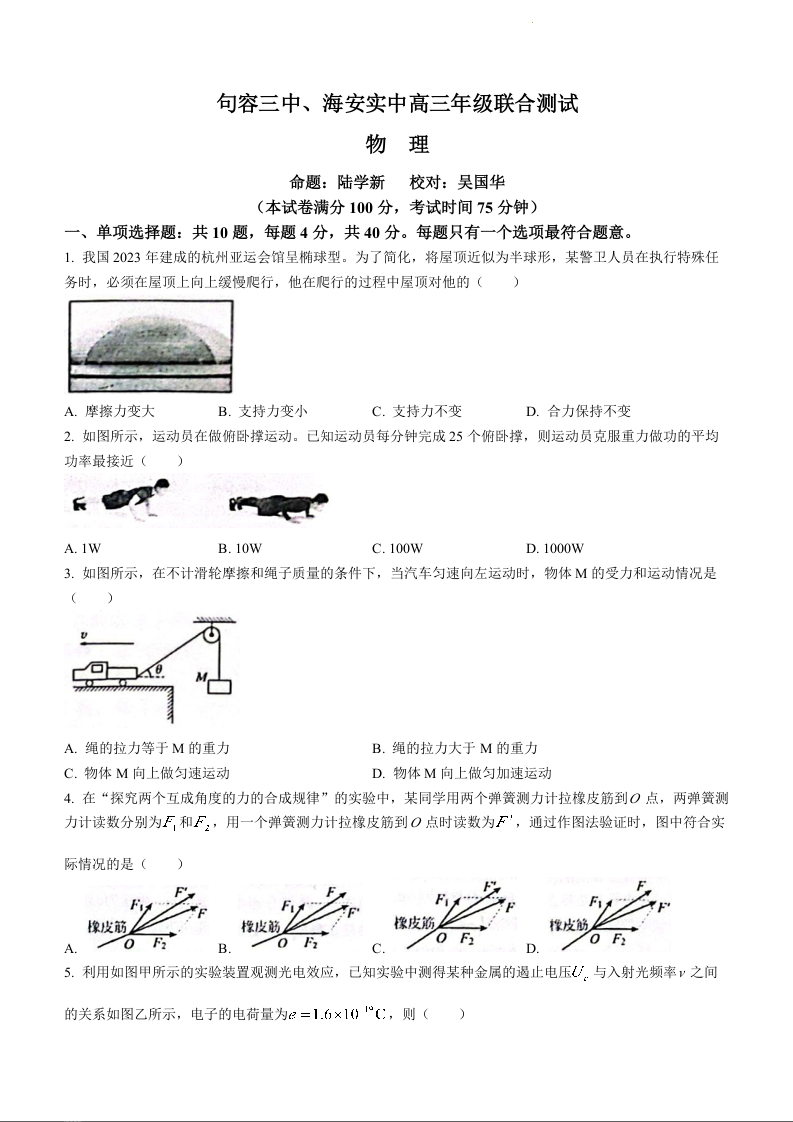 江苏省句容三中、海安实验中学联考2023-2024学年高三上学期10月月考试题物理