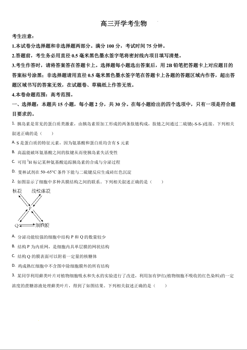 吉林省梅河口市第五中学2024届高三上学期开学生物+答案