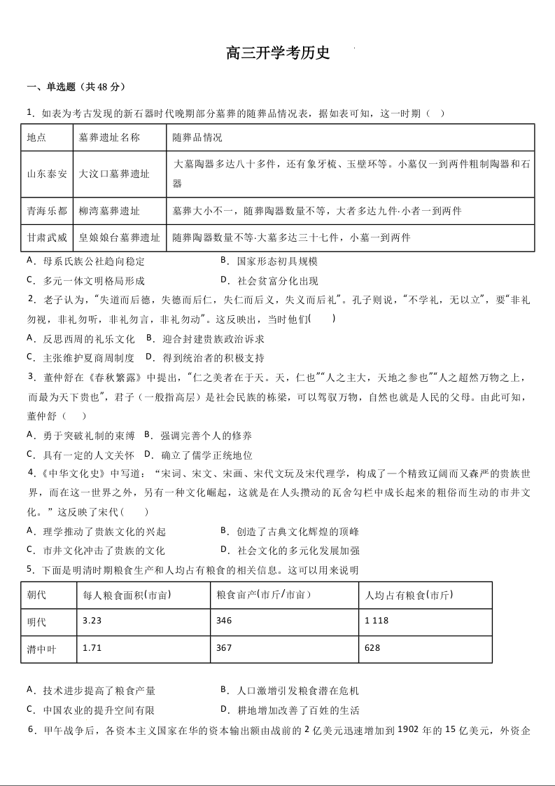吉林省梅河口市第五中学2024届高三上学期开学历史+答案