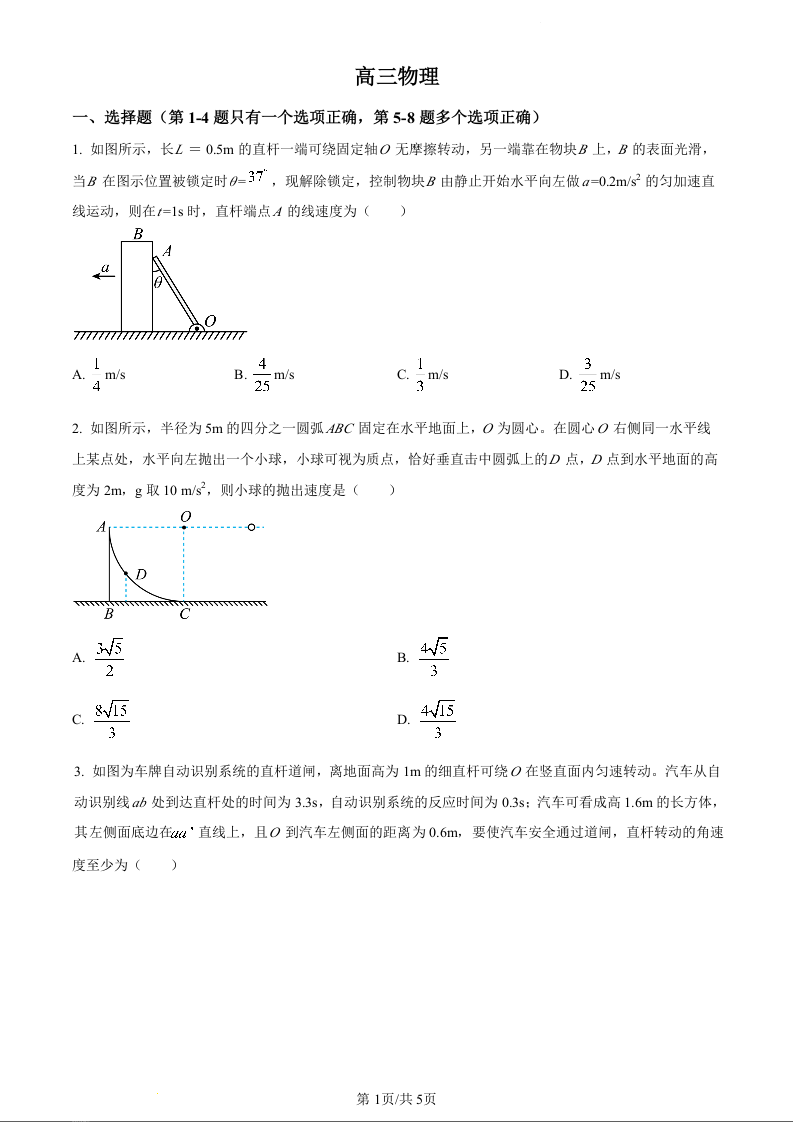 吉林省通化市梅河口市第五中学2024届高三上学期9月月考物理(原卷版)