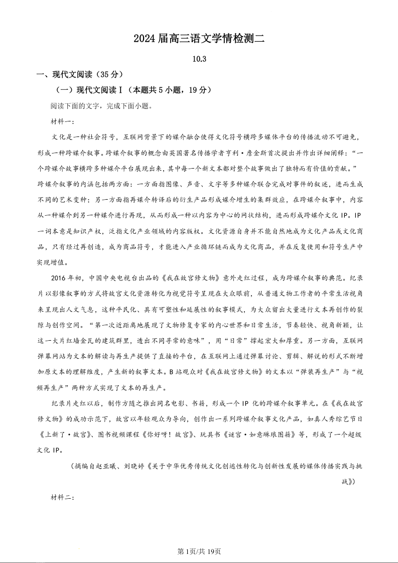 江苏省海安市实验中学2024届高三上学期10月月考语文(精品解析版)