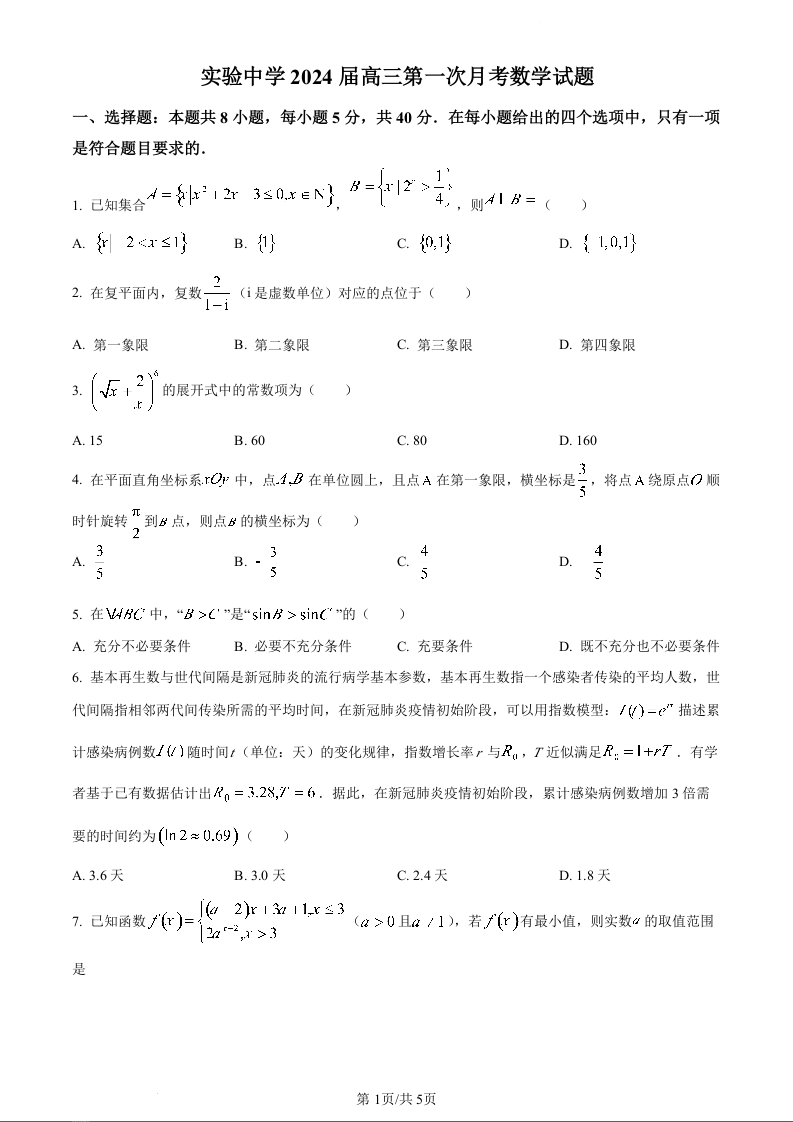 江苏省海安市实验中学2024届高三上学期10月月考数学(原卷版)