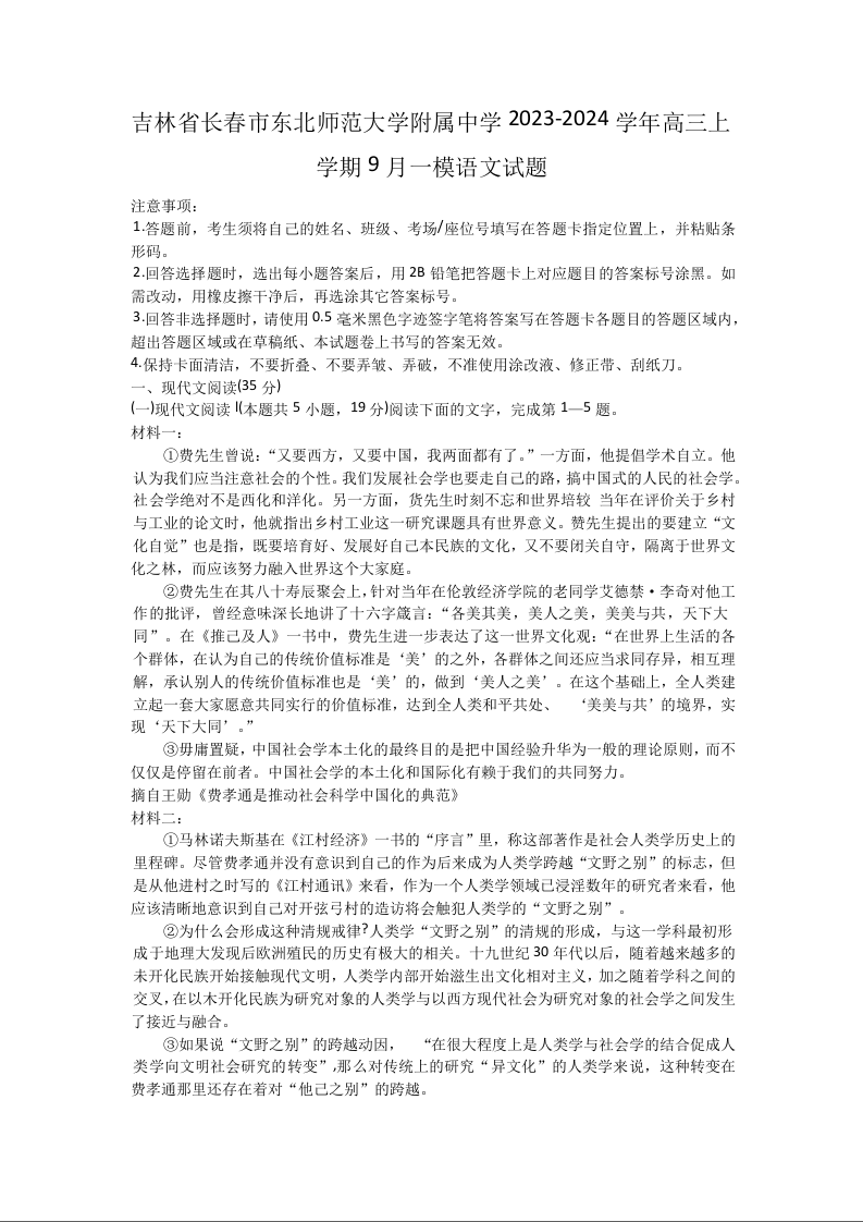 吉林省长春市东北师范大学附属中学2024届高三上学期9月语文