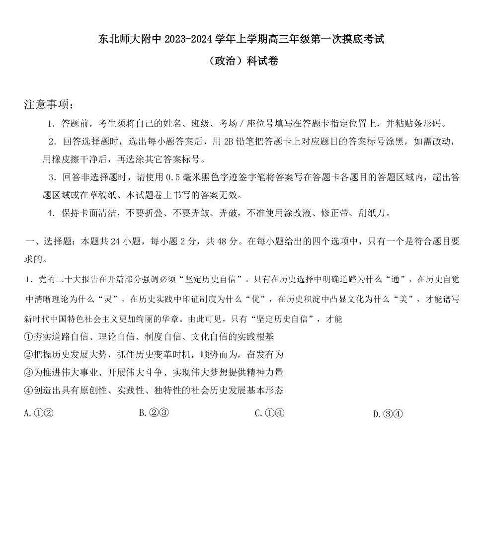 吉林省长春市东北师范大学附属中学2024届高三上学期9月政治
