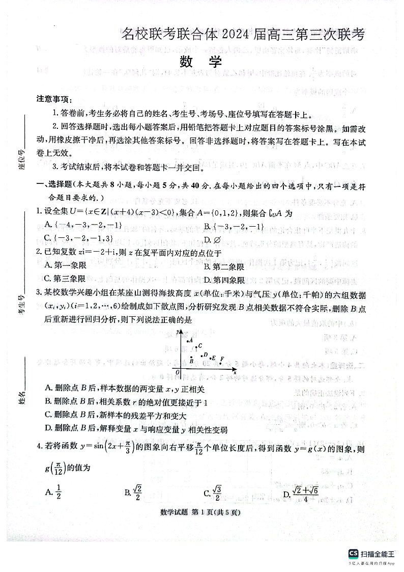 湖南炎德英才大联考名校联考联合体2024届高三第三次联考数学