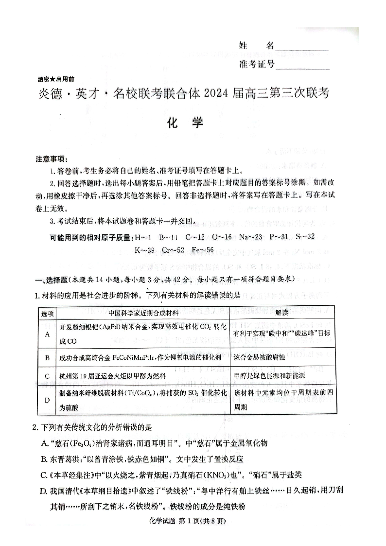 湖南炎德英才大联考名校联考联合体2024届高三第三次联考化学