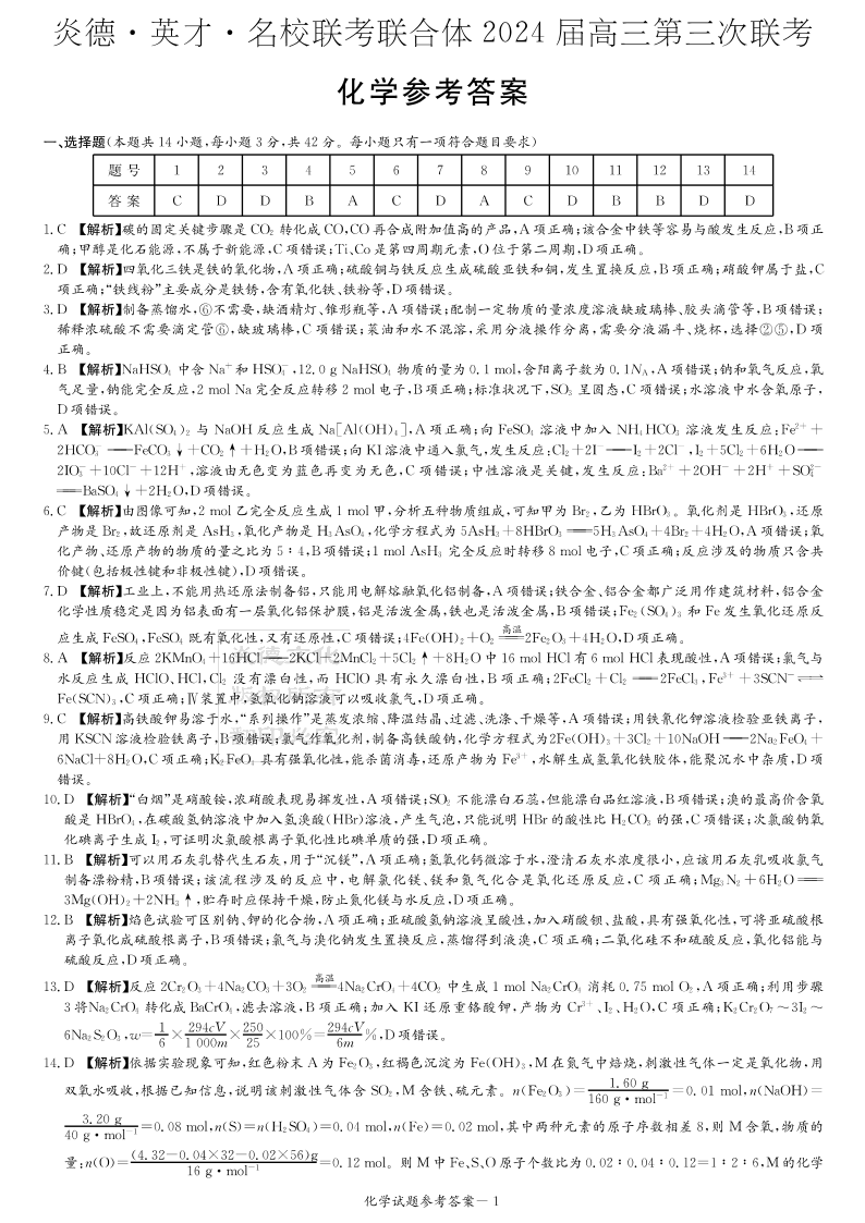 湖南炎德英才大联考名校联考联合体2024届高三第三次联考化学答案