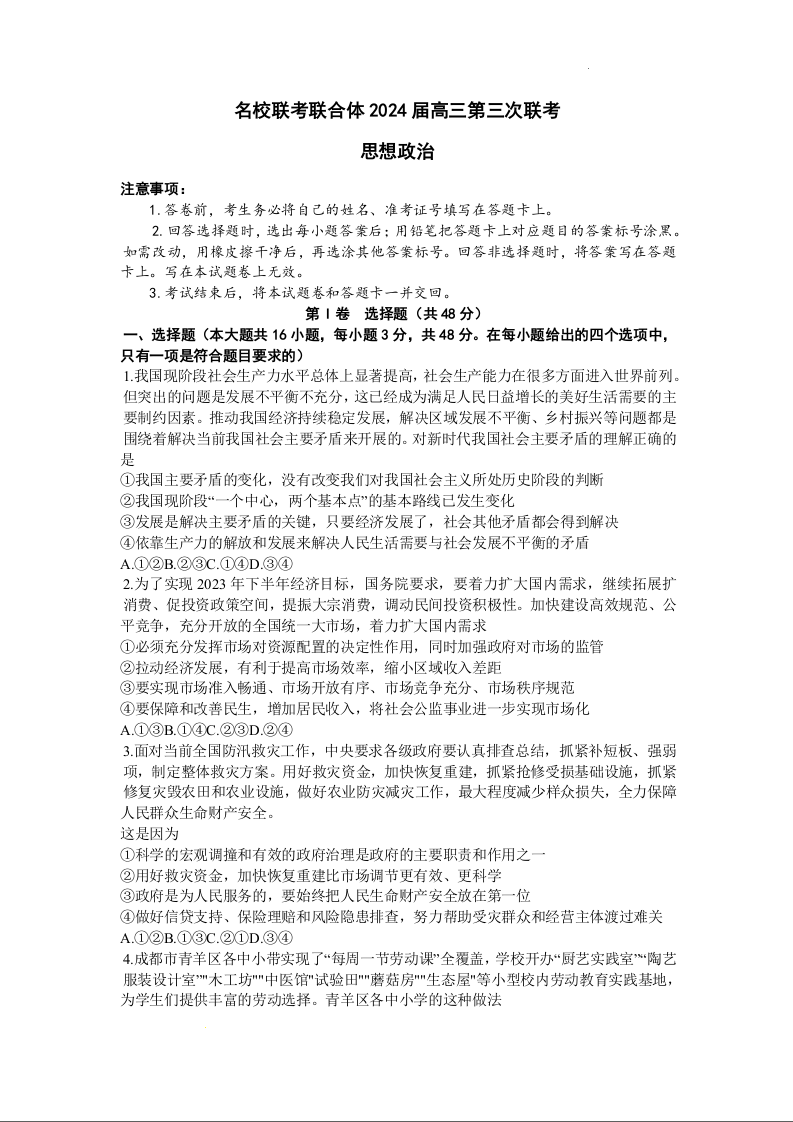 湖南炎德英才大联考名校联考联合体2024届高三第三次联考政治+答案
