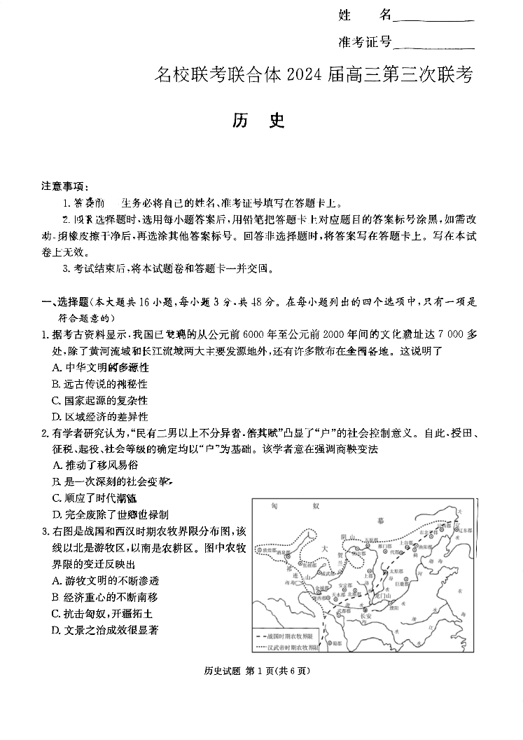 湖南炎德英才大联考名校联考联合体2024届高三第三次联考历史