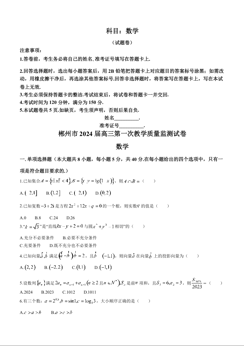 湖南省郴州市2024届高三上学期第一次教学质量监测试卷数学+答案