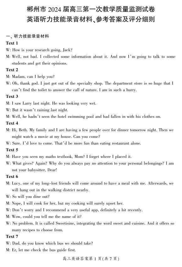 湖南省郴州市2024届高三上学期第一次教学质量监测试卷英语答案
