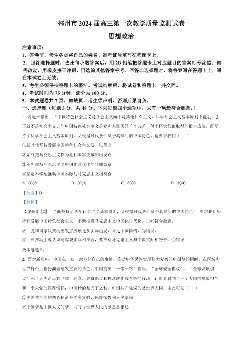 湖南省郴州市2024届高三上学期第一次教学质量监测试卷政治(解析版)