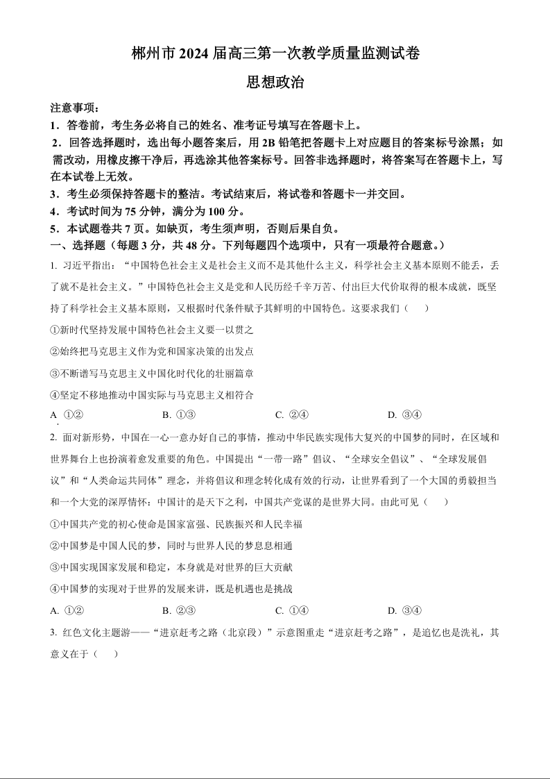 湖南省郴州市2024届高三上学期第一次教学质量监测试卷政治(原卷版)
