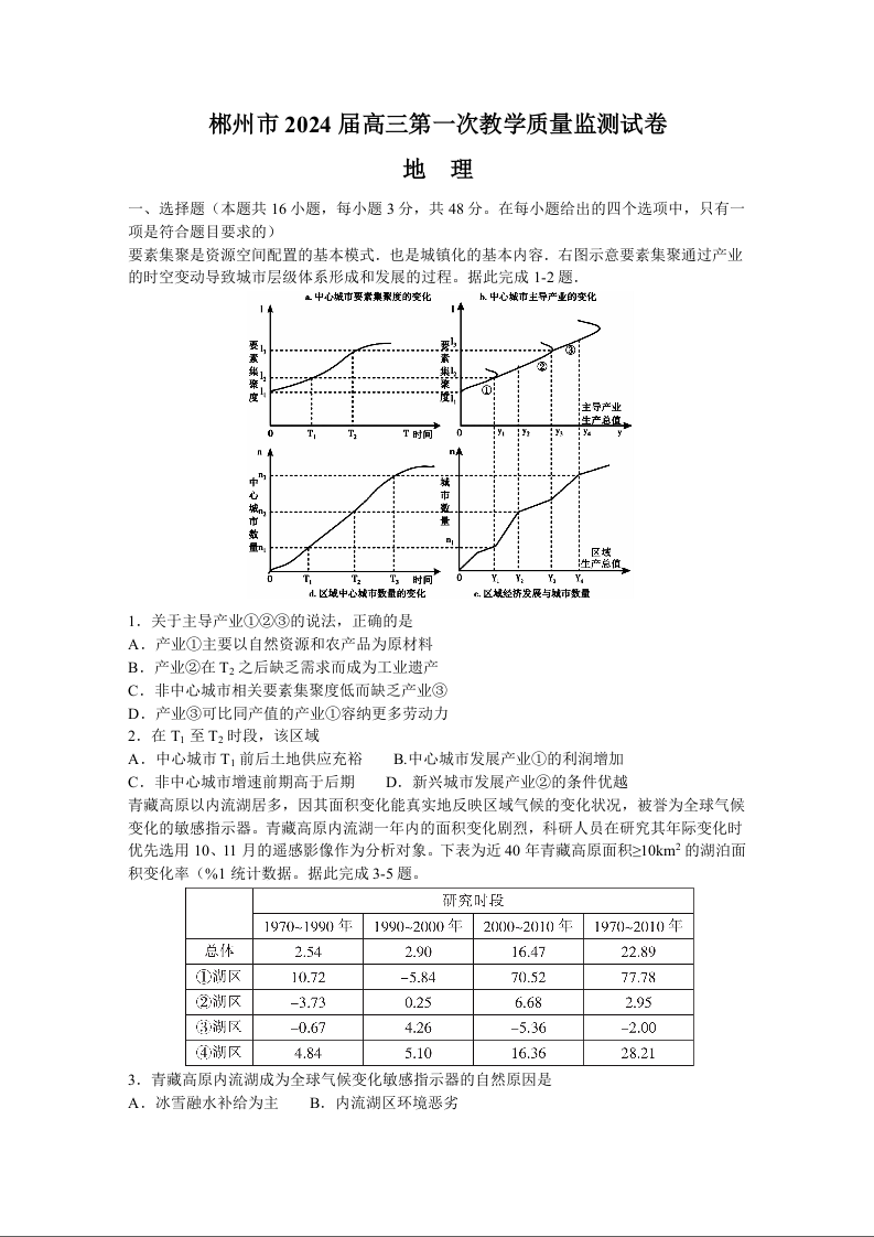 湖南省郴州市2024届高三上学期第一次教学质量监测试卷地理+答案