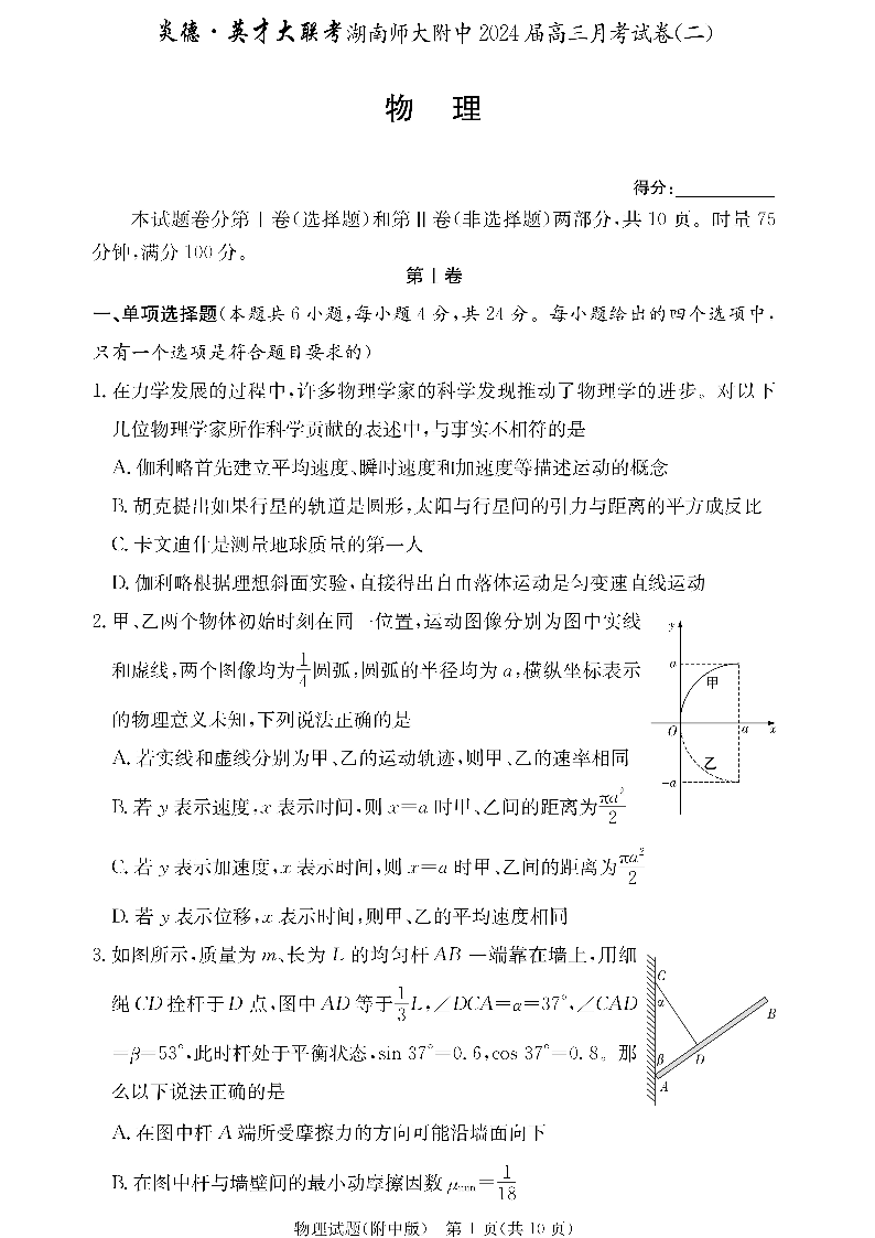 湖南师范大学附属中学2024届高三上学期月考(二)物理+答案