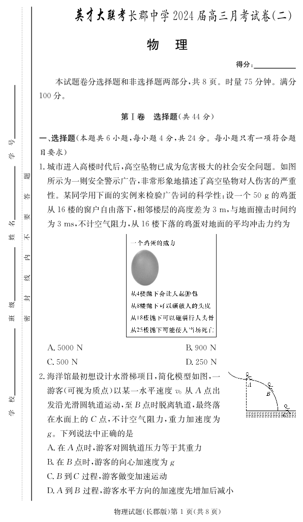 湖南省长沙市长郡中学2024届高三上学期月考卷(二)物理