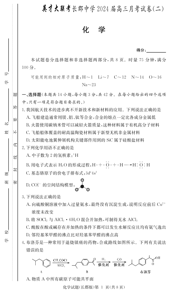 湖南省长沙市长郡中学2024届高三上学期月考卷(二)化学