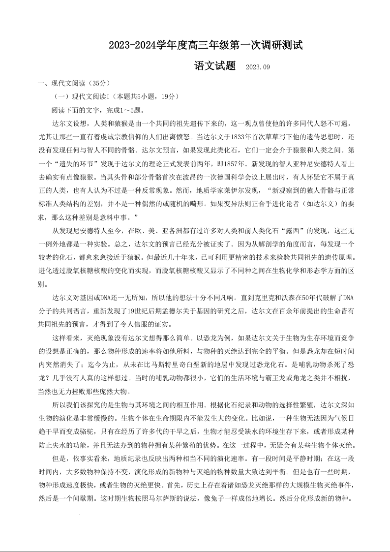 江苏省淮安市2024届高三上学期开学调研测试语文