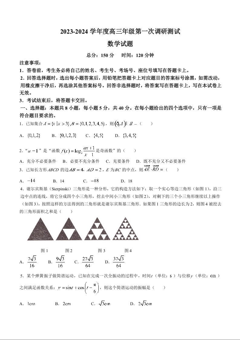 江苏省淮安市2024届高三上学期开学调研测试数学+答案