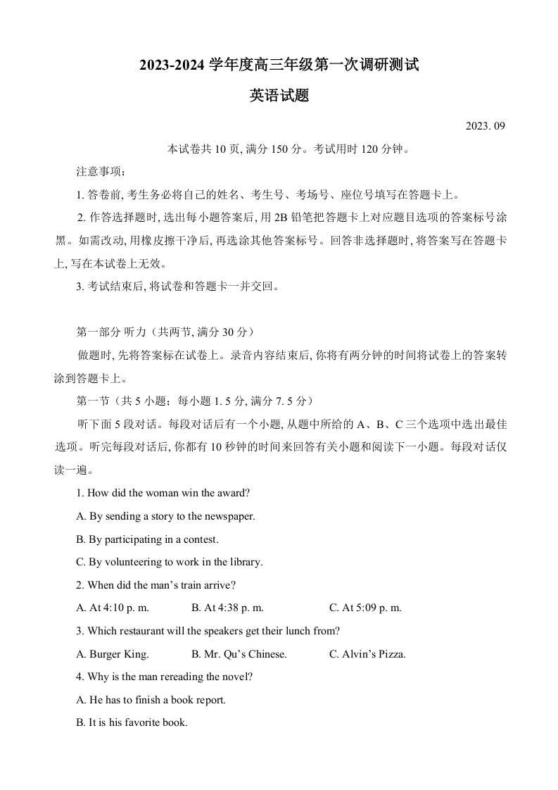 江苏省淮安市2024届高三上学期开学调研测试英语