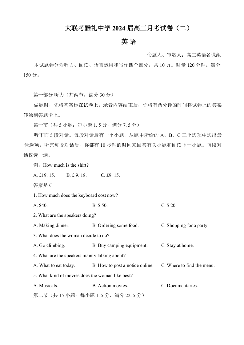 湖南省长沙市雅礼中学2024届高三上学期月考试卷(二)英语