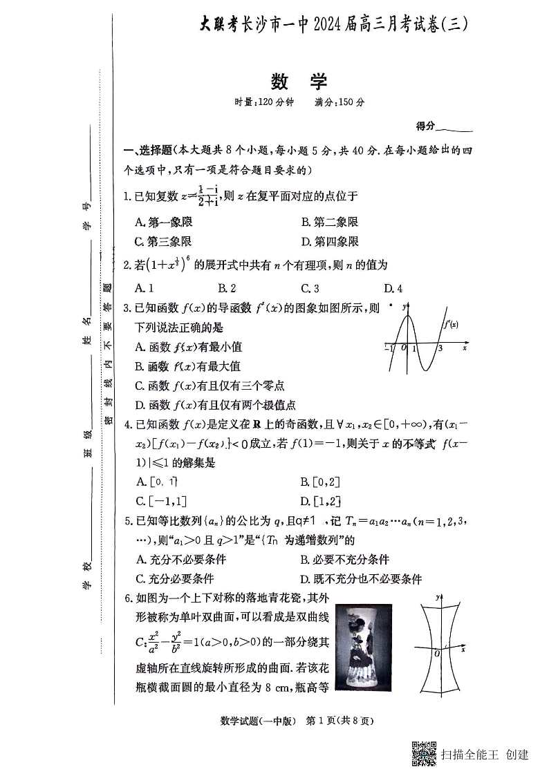 湖南省长沙市第一中学2024届高三上学期月考卷(三)数学
