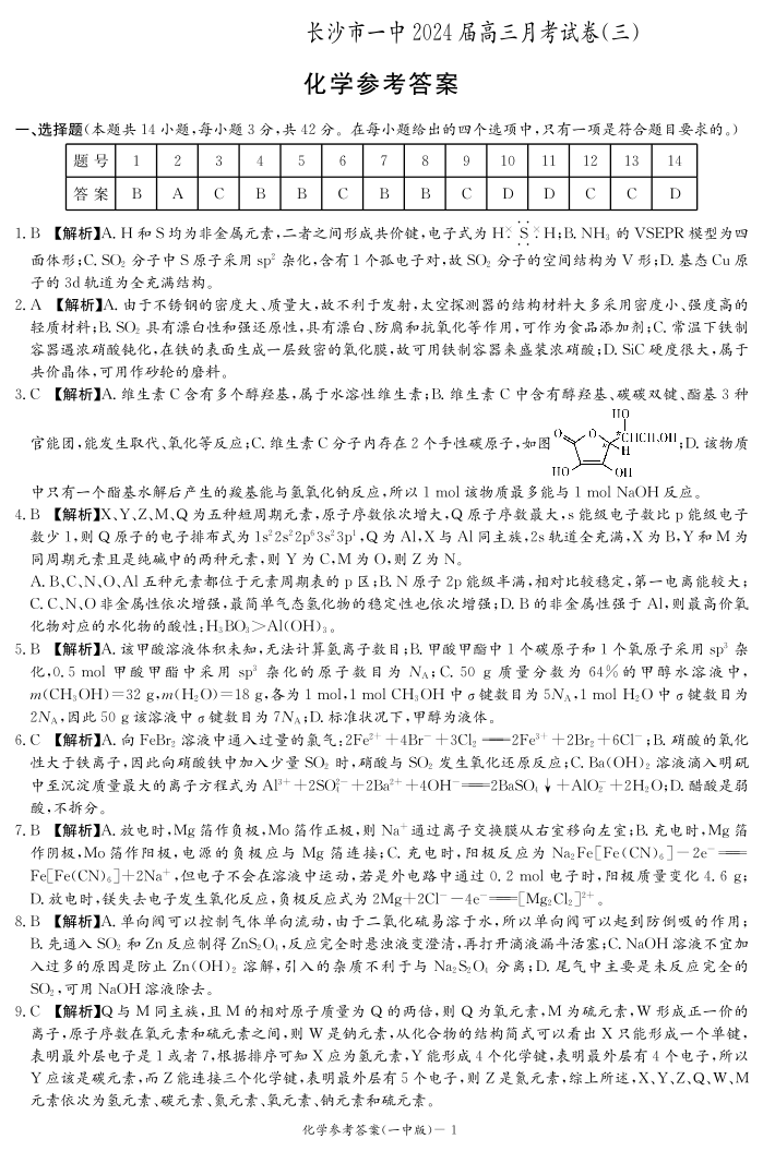 湖南省长沙市第一中学2024届高三上学期月考卷(三)化学答案