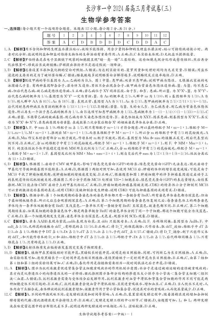 湖南省长沙市第一中学2024届高三上学期月考卷(三)生物答案
