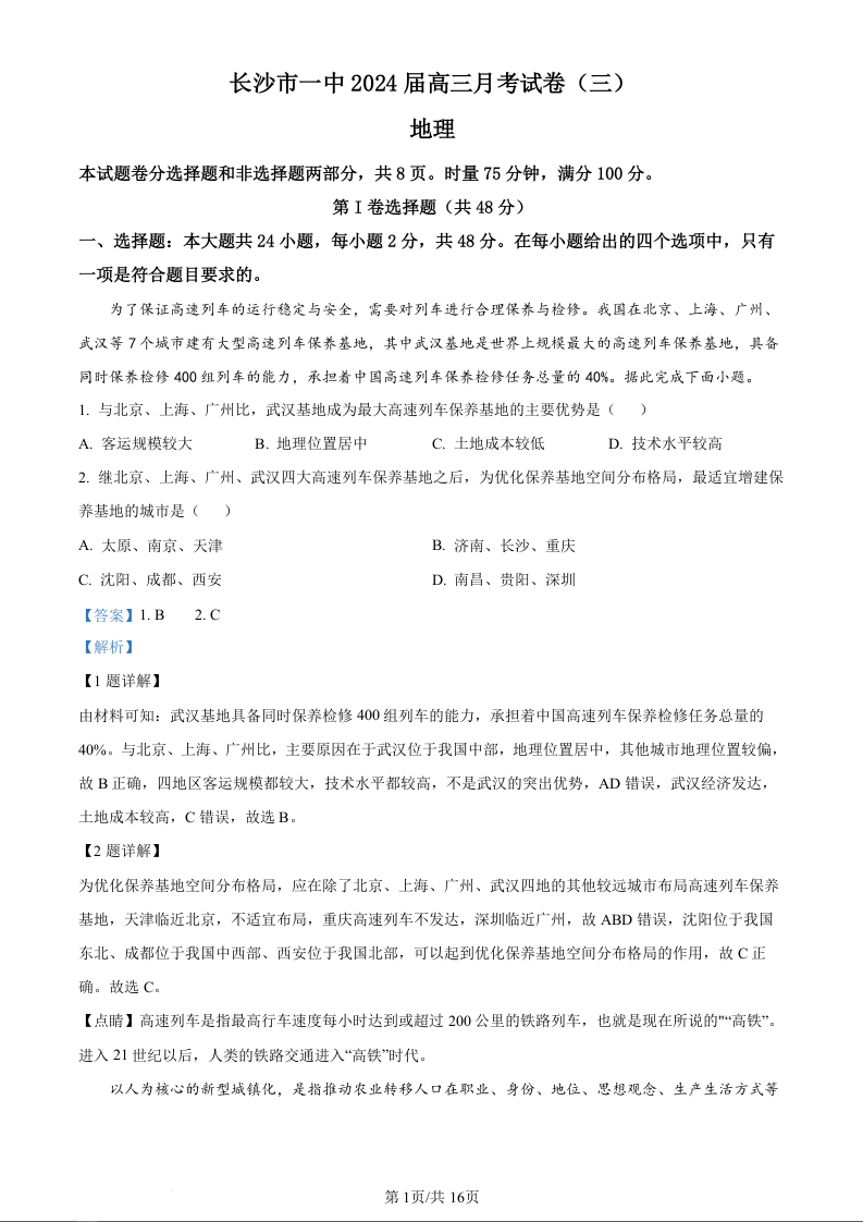 湖南省长沙市第一中学2024届高三上学期月考卷(三)地理(精品解析版)