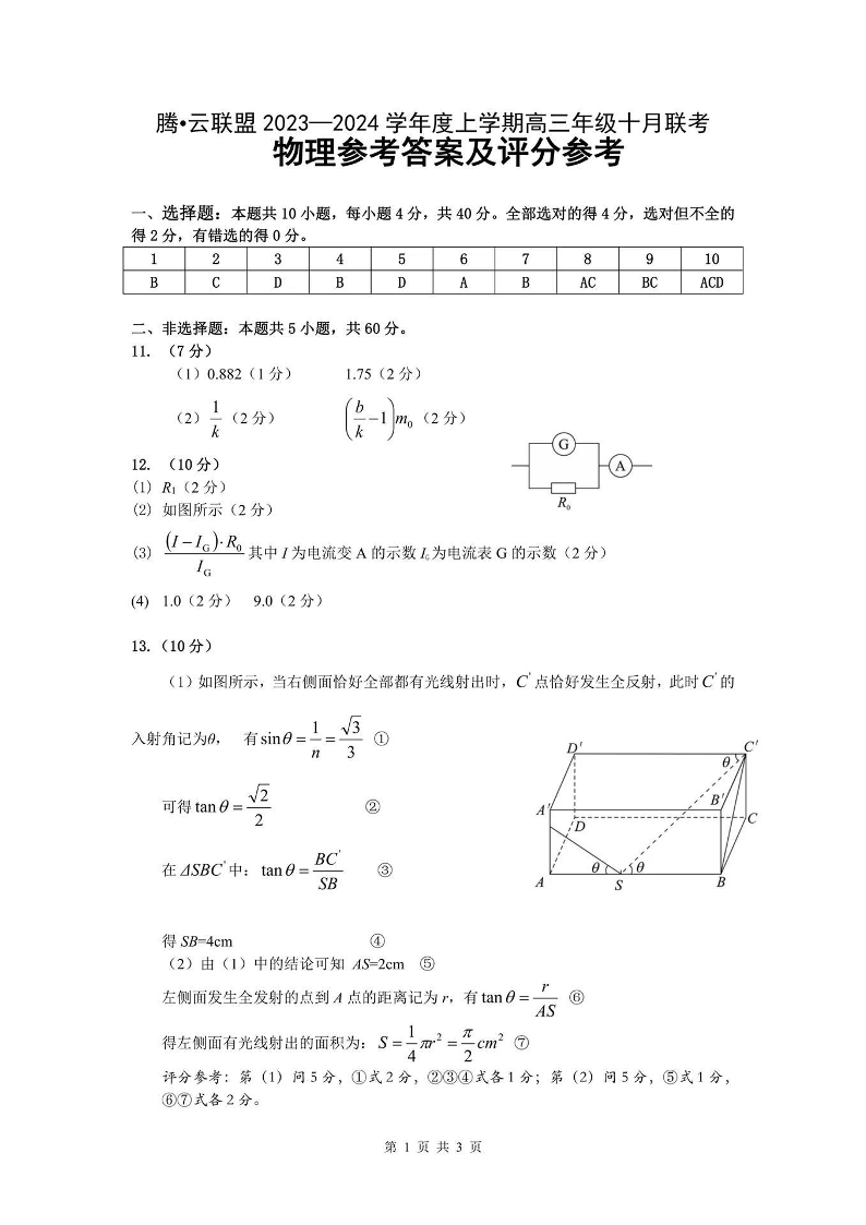 湖北省腾云联盟2024届上学期高三年级十月联考物理答案