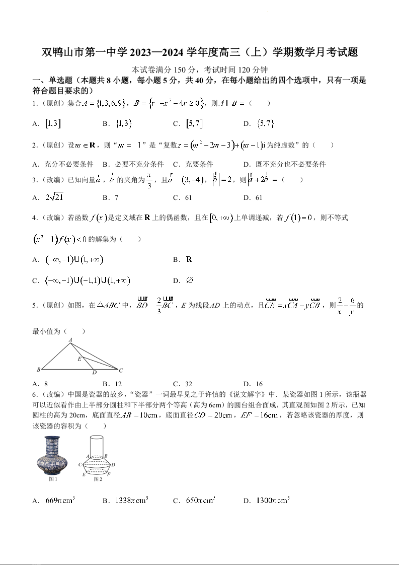 黑龙江省双鸭山市第一中学2024届高三上学期10月月数学
