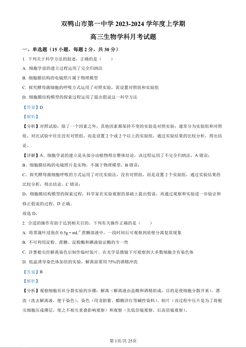 黑龙江省双鸭山市第一中学2024届高三上学期10月生物(精品解析版)