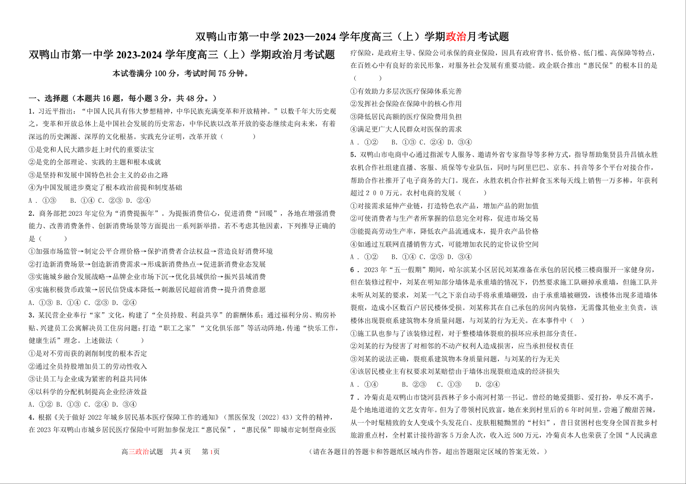 黑龙江省双鸭山市第一中学2024届高三上学期10月政治