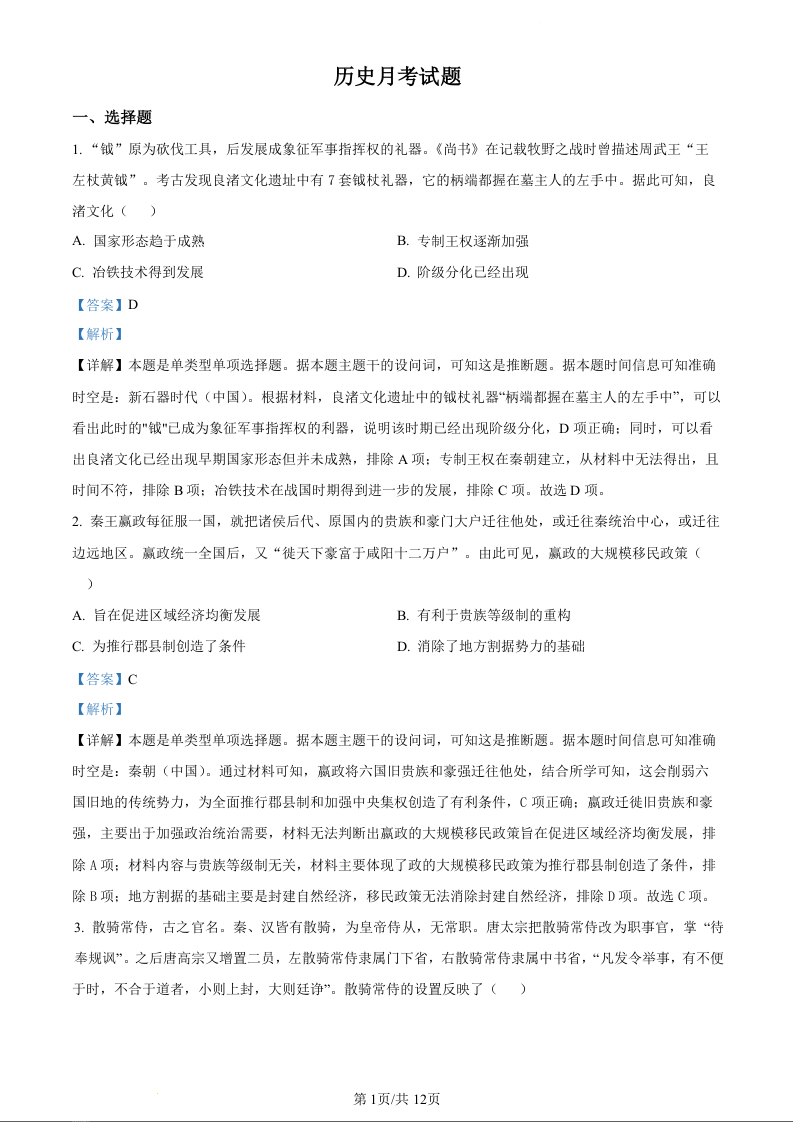 黑龙江省双鸭山市第一中学2024届高三上学期10月历史(精品解析版)