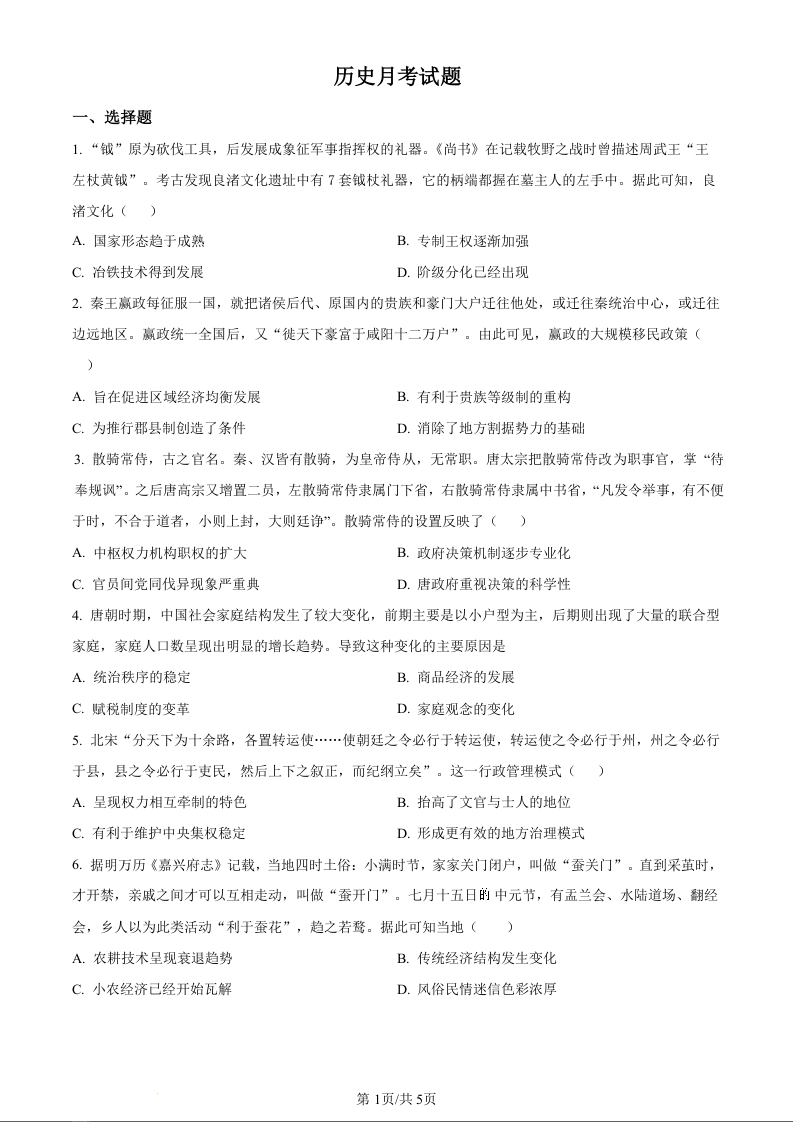 黑龙江省双鸭山市第一中学2024届高三上学期10月历史(原卷版)