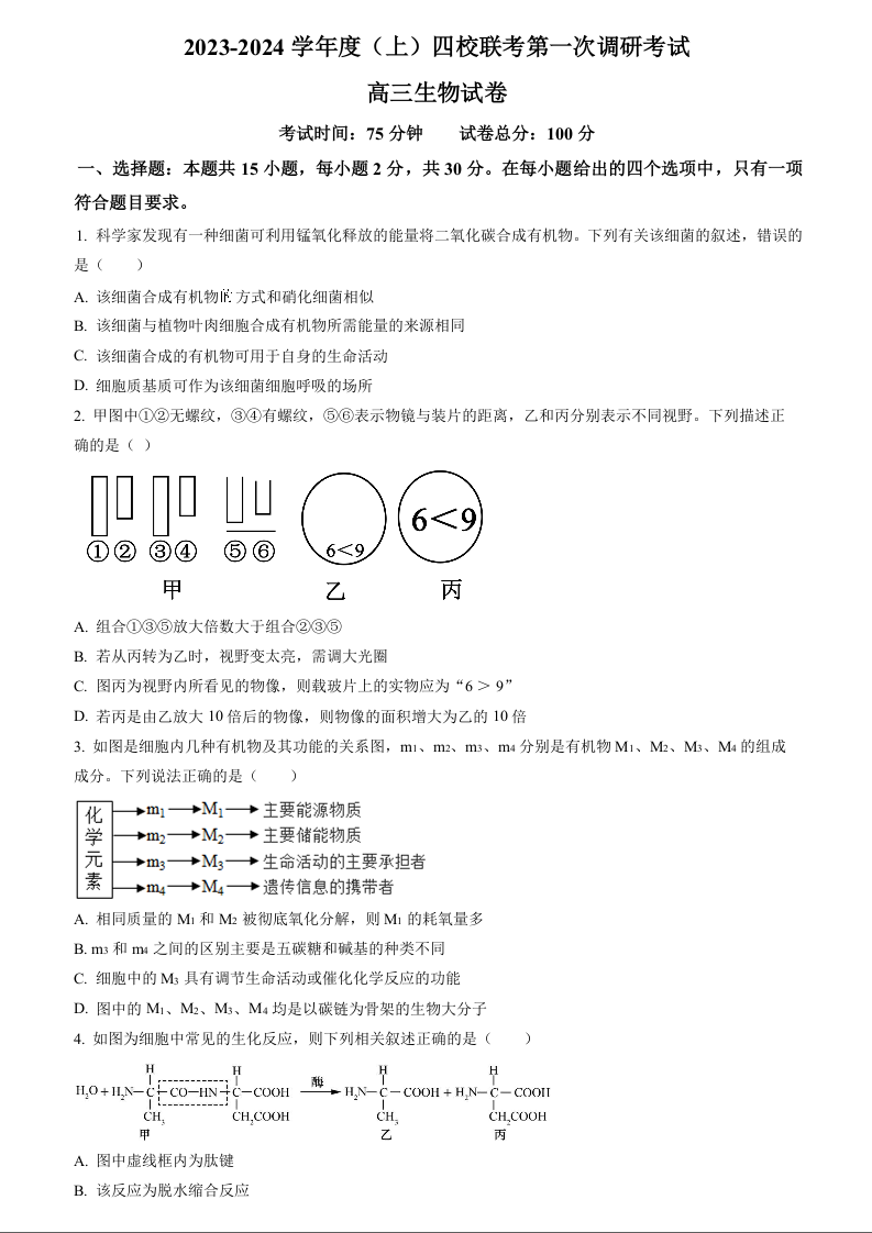 黑龙江省佳木斯高中教学联合体2024届高三上学期10月月考生物+答案