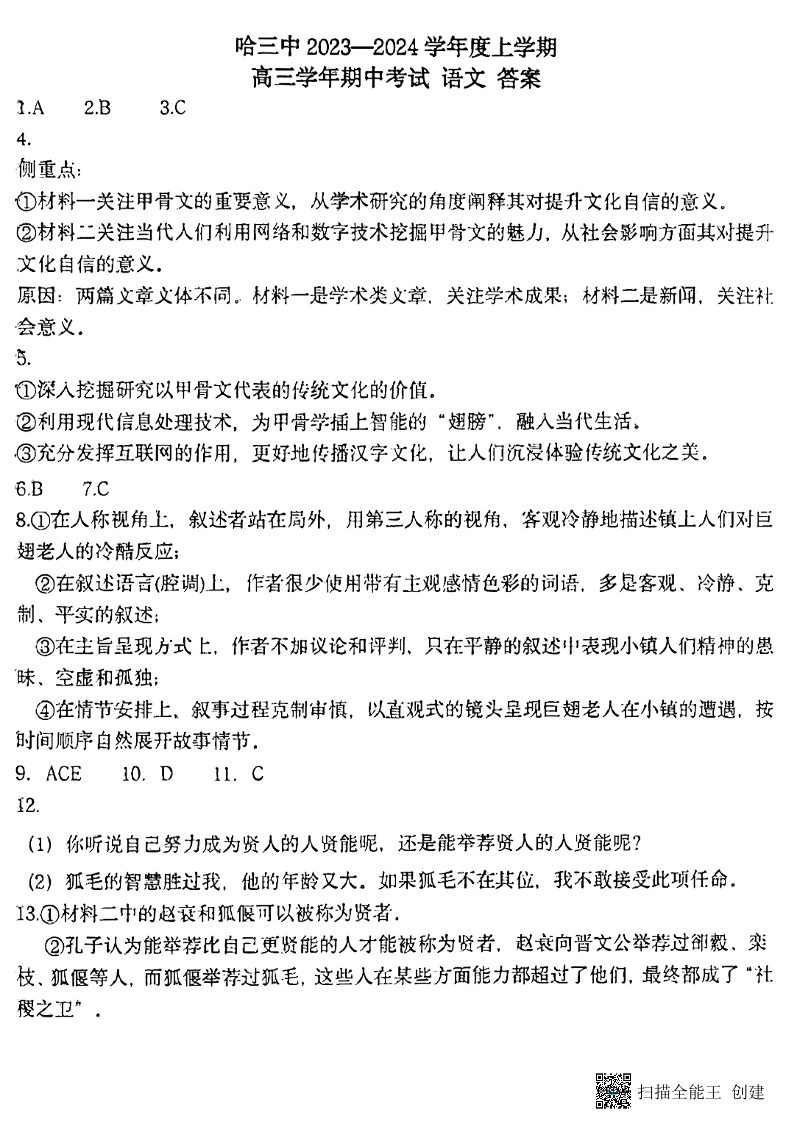 黑龙江省哈尔滨市第三中学校2024届高三上学期期中考试语文答案