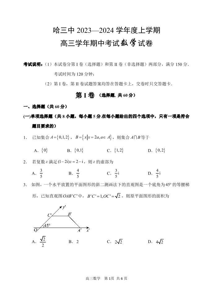 黑龙江省哈尔滨市第三中学校2024届高三上学期期中考试数学