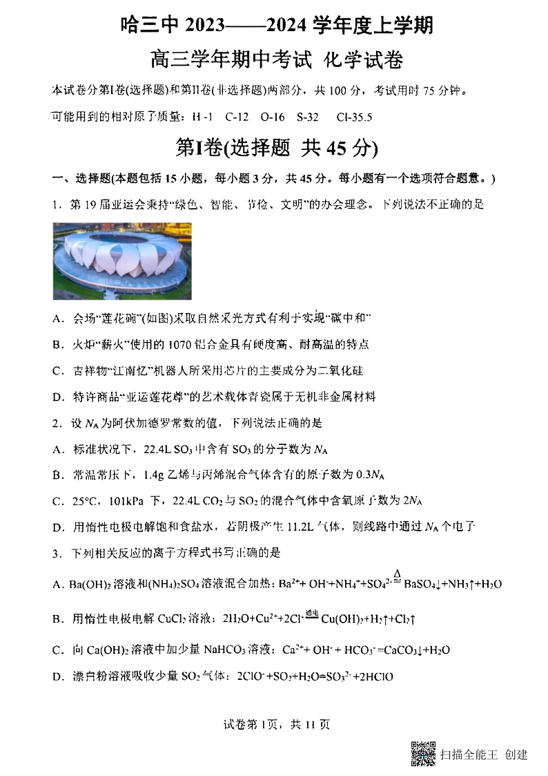 黑龙江省哈尔滨市第三中学校2024届高三上学期期中考试化学