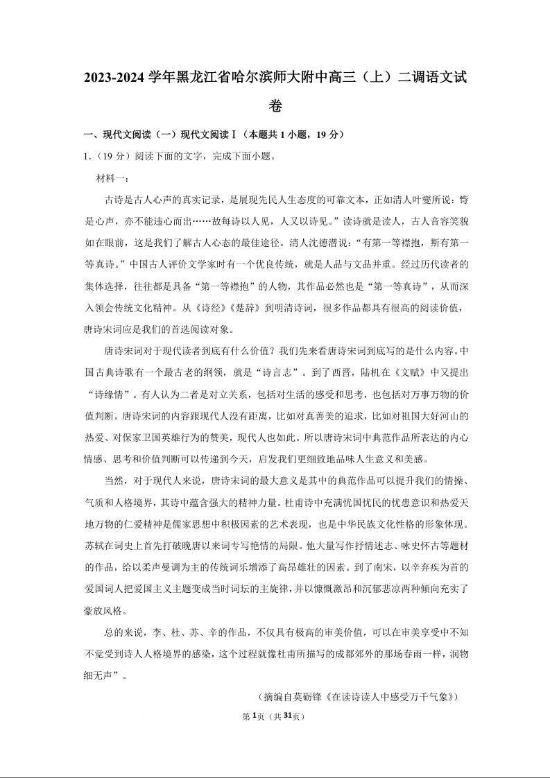 黑龙江省哈尔滨师范大学附属中学2024届高三上学期第二次调研考试语文(解析版)