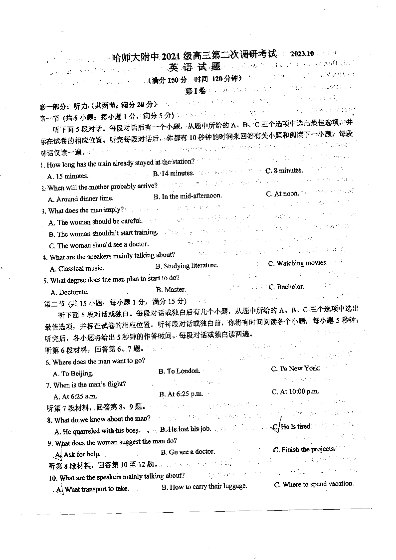 黑龙江省哈尔滨师范大学附属中学2024届高三上学期第二次调研考试英语
